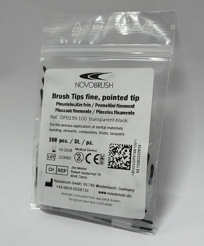 NOVOBRUSH Einmal-Pinseleinsätze sind präzise Alltagshelfer in jeder Praxis: Für Ätz- oder Bondingmaterialien, Lacke oder Zahnweiss, Komposite oder sonstige flüssige Dentalmedien. Die Pinseleinsätze können mit dem NOVOBRUSH Pinselhalter oder dem NOVOBRUSH MicroTip-Halter verwendet werden.